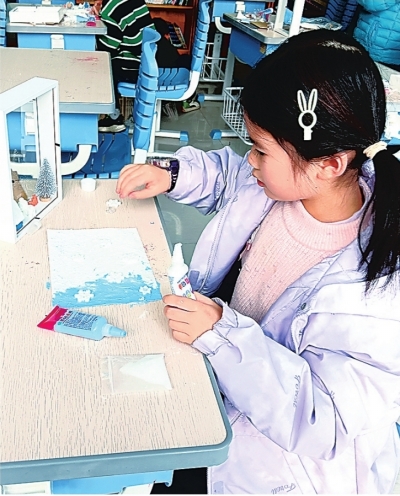 在创意制作环节,孩子们展现出丰富的想象力,迫不及待开始创作。“我要用这个扇贝做蝴蝶的翅膀!”“我把海螺变成了小蜗牛的家!”现场洋溢着童真的话语。9岁的王明轩一边小心翼翼地将贝壳粘贴到画布上,一边向小伙伴解释:“贝壳是软体动物的‘小房子’,它们走到哪里就把‘家’带到哪里。”当一幅幅作品完成时,孩子们兴奋地展示着自己的作品。