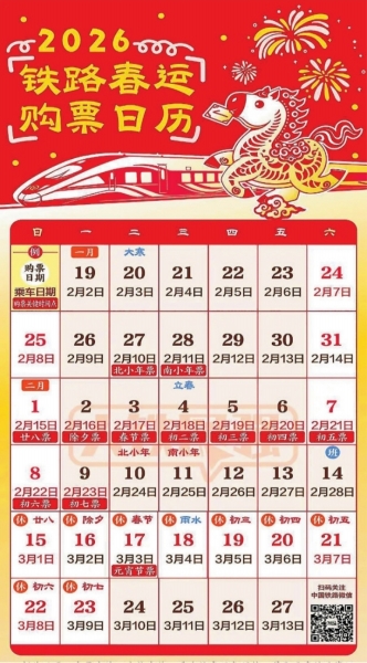 2月13日(腊月二十六)车票将于1月30日起售;