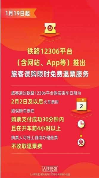 记者18日从中国国家铁路集团有限公司获悉,1月19日起,铁路12306平台(含网站、APP等)推出旅客误购限时免费退票服务,旅客通过铁路12306平台购买乘车日期为2月2日及以后火车票时,如误购车票在购票支付成功30分钟内且在开车前4小时以上,购票人可线上自助办理退票,不收取退票费。