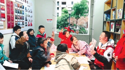 | 东兴社区瑞府11栋架空层被改造成共享书屋,“周五趣学堂”讲历史故事。 |