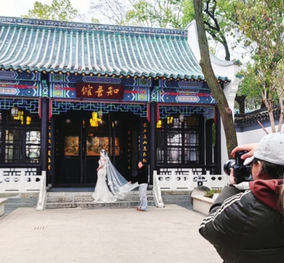 | 新人在古琴台拍摄婚纱照。 记者金文兵 摄 |