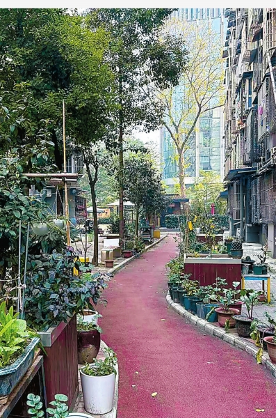 | 在江汉区北湖街道建设社区曾将4个老旧小区分隔成“孤岛”的围墙已无影无踪,取而代之的是一条连通一体的步行道、邻里共育的共享花园(红色步道位置原本是一面墙)。 记者余睿 摄 |