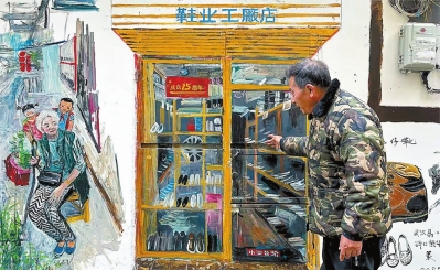 | 易小阳介绍墙绘,他左侧画中的李家秀笑眯了眼。 记者余睿 摄 |