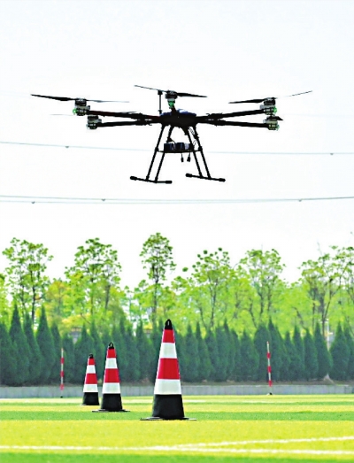 | 洪山区武金堤路与杨泗港快速通道交会处,白沙滨江飞行营地的草坪上,一台中型无人机正在进行绕桩飞行演示。 记者余睿 摄 |
