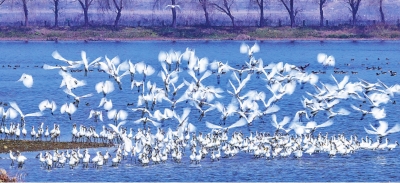 | 府河湿地天鹅湖翔集的白琵鹭。 李梓固 摄 |