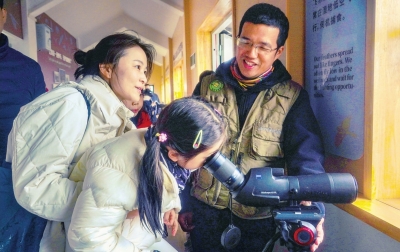 | 市民在志愿者指导下,在沉湖湿地观鸟。 记者李子云 摄 |