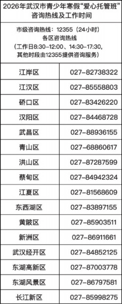 武汉晚报讯(记者刘克取 通讯员武小青)前日记者获悉,2026年武汉市青少年寒假“爱心托管班”报名将于1月27日上午10:00正式启动。本期托管班服务时间为2月2日至2月6日8:00至18:00,为有需要的家庭提供免费托管服务。