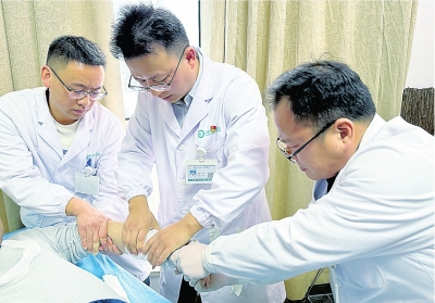 市民周先生(化姓)从2米多高处摔下,左手桡骨粉碎性骨折。他不想开刀做手术,特意赶到武汉市中医医院汉阳院区骨伤科的“正骨(骨折手法复位)专病门诊”求治。21日上午,该科中医骨折病房副主任徐平团队为周先生进行手法复位。两名医生分别牵拉周先生的手和肘关节,徐平握住骨折处前后摇摆,“分离”骨折处被嵌顿的肌肉、凝血块等,让韧带组织将错位的骨骼“送回”原位。再经过手法旋转调整,确认断骨基本复位后,徐平将提前裁剪塑形过的杉树皮夹板绑在骨折处进行固定。复诊4至6周后,骨折就可基本痊愈。