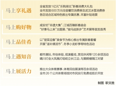武汉市商务局负责人介绍,本次消费季将深度联动省市、区、三级资源,推出“马上享礼遇”多重消费礼遇,切实让市民游客住得舒心、吃得开心。从1月26日起,全省发放1亿元“乐购湖北”新春消费大礼包,还同步投入5000万元开展有奖发票幸运抽奖活动;全市发放600万元住宿餐饮消费券及武汉冰雪消费券,全方位保障市民游客欢度新春。