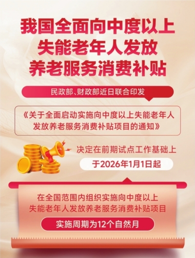 1月22日,民政部、财政部对外公布一项暖心政策:在前期试点的基础上,从2026年1月1日起,在全国范围内向中度以上失能老年人发放养老服务消费补贴,每人每月最高800元,实施周期为12个自然月。