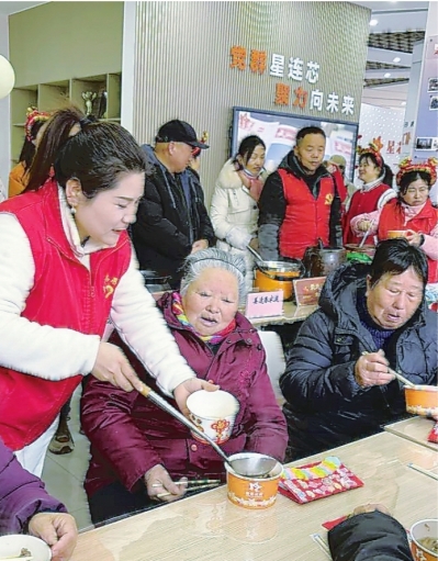 “星益便民屋”门前,76岁的姜佑华接过志愿者递来的腊八粥,笑着说:“这粥熬得稠,比我们自己煮的好。”