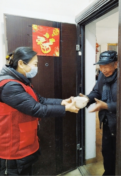 | 志愿者将腊八粥送到居民家中。 社区供图 |