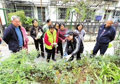 | 居民们一起交流养花技巧。 |