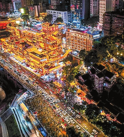 | 重庆渝中区戴家巷(右侧)、洪崖洞(左侧)城市夜景。 新华社发 |