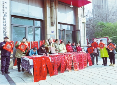 活动现场,汉阳区政协委员罗成伟、陈永明与太和琴社书法老师刘波、琴台小学师生代表一同挥毫泼墨。一副副寓意吉祥的春联、一个个饱满的“福”字跃然纸上,让在场居民提前感受到浓浓年味。“手写的春联更有意义!”居民王阿姨拿着墨迹未干的春联,喜笑颜开。