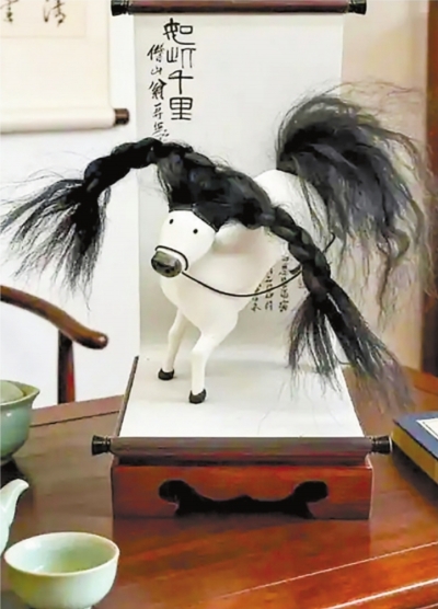别看“马彪彪”造型如此“随意”,它的设计灵感是来源于齐白石大师的《如此千里》画作。“马彪彪”是山东美术馆展出的一款软陶小马文创,设计者介绍,“马彪彪”一共有八款不同造型,它的头发用的是仿真毛发,可以自行给小马编小辫儿。
