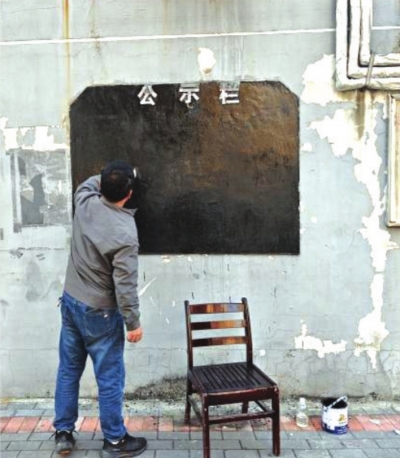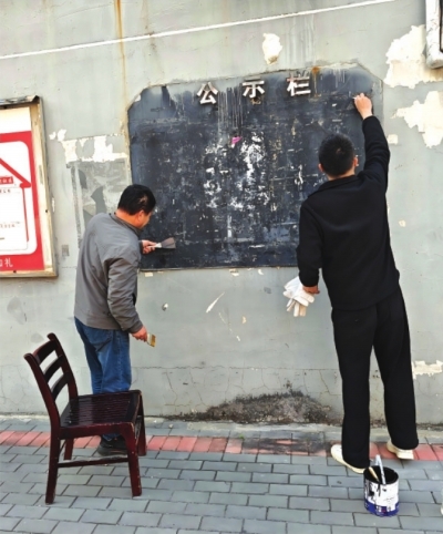 | 社区工作人员清理公示栏。 |