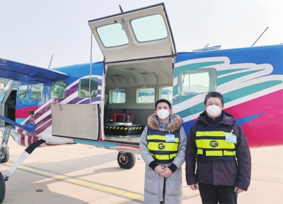 | 傅晓俊(右)和同事准备进行航摄,身后是已安装好航摄仪器的专用飞机。 |
