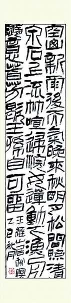 | 《山居秋暝》 王维诗 释文:空山新雨后,天气晚来秋,明月松间照,清泉石上流。竹喧归浣女,莲动下渔舟,随意春芳歇,王孙自可留。 作者:毛祥军 (62岁) 汉阳区老年大学 |