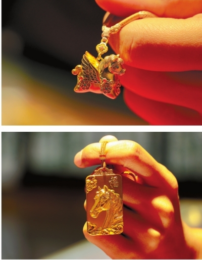 记者在某商场黄金饰品专柜,马年主题金饰整齐陈列,Q版萌趣小马吊坠、“马上有福”吉祥手链、灵动飞马挂件等饰品工艺精湛、寓意吉祥,吸引了不少市民前来选购,特别是小克重的“马元素”饰品最受欢迎。
