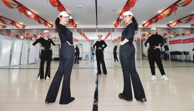 | 凤栖桐模特形体管理教研团队的老师们在社区共享空间排练,她们已培养出不少自信爱美的中老年走秀群体。 |