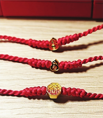 “特意来给侄子侄女挑春节礼物,不需要太贵重,但一定要有仪式感。”29岁的刘先生向记者展示刚购入的三根手绳,上面分别系着“平安”字样牌与葫芦造型挂坠,每件金饰克重约0.4克,三件总价1995元。