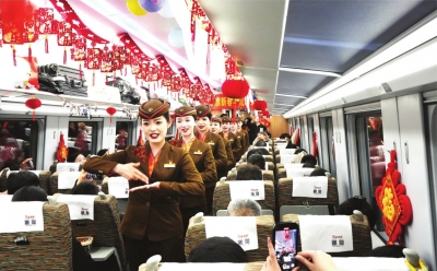 车厢内红灯笼高挂、铁路老照片错落陈列,窗花、中国结、彩色气球点缀其间,浓郁的年味扑面而来。最吸引旅客驻足观赏的是乘务员带来的铁路老物件T台秀,7名乘务员身着不同年代的铁路制服,手捧老式票证、检票票钳、旧版列车时刻表、老式路徽等铁路实物依次亮相。每一件老物件都承载着一段铁路历史,从纸质硬板票到电子客票,从手工检票到智能闸机,从蒸汽机车到复兴号动车组,跨越数十年的老物件,串起中国铁路从追赶时代到领跑世界的壮丽征程。