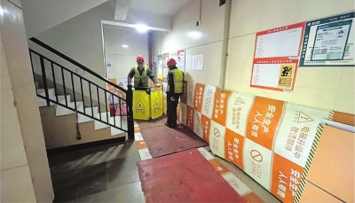 | 电梯更新前,工作人员做好安全维护工作。 |