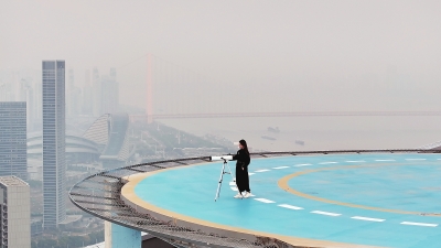 酒店顶楼的吨级eVTOL停机坪上,入住游客可登顶欣赏天际线。