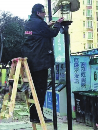 | 物业公司工作人员维护小区路灯。 |