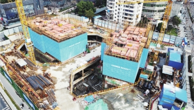 当日上午,记者在施工现场看到,两栋住宅塔楼正位于地铁三阳路站D出入口旁边,一栋紧邻解放大道,另一栋紧邻三阳路,从空中俯瞰呈“L”形。120余名建设者分布在各个作业面,绑扎钢筋、浇筑混凝土、搭设支架,各个工序有条不紊推进。