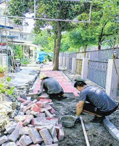 便民小道工程设计过程中,广泛听取居民建议,融合群众智慧,最终确定工艺与内容:一是选用透水砖铺设路面,提升雨水渗透效率,有效缓解路面积水问题;二是对沿线铁艺围栏进行除锈、刷新,提升整体美观度;三是施工过程中严格保护小道旁全部树木,实现功能提升与绿植保护并重;四是创新提出“共享花园”理念,针对喜爱种花的住户,将其精心打造的小花园作为社区共享花园试点,既尊重和保留居民的个人投入,又转化为社区公共福利。由居民继续负责花园日常养护,花园同时作为社区“打卡点”,邻里之间可在此交流园艺心得,往来居民亦可欣赏美景、拍照留念,实现个人情感与公共效益的有机融合。