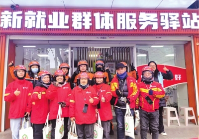 | 红卫路街道新就业群体服务驿站暖新行动送温暖,张鹏(前排右二)和小伙伴合影。 |