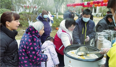 | 居民们有序领取汤圆。 |