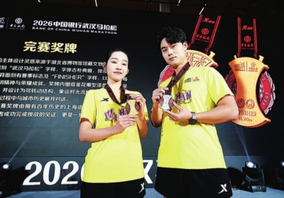 据介绍,汉马完赛奖牌的主体设计灵感来源于湖北省博物馆馆藏文物明金锭,正面采用小篆体镌刻“武汉马拉松”字样,字体古朴典雅,体现了荆楚文化的深厚底蕴;背面刻有赛事标志及“FINISHER”字样,以此铭刻每位完赛跑者的坚韧精神与荣耀成就。