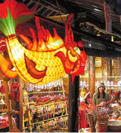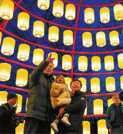 | 游客在杭州西溪湿地的花灯下参观、留影。 新华社发 |