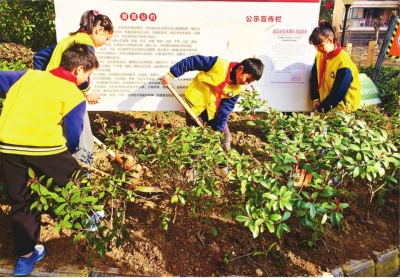 | 小学生们为社区植绿。 |