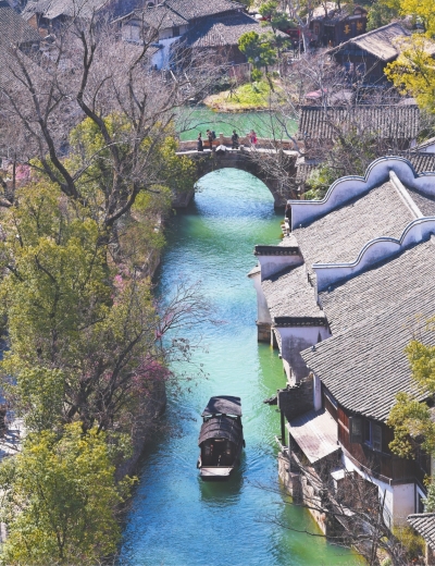 | 近日,游客乘船游览桐乡市濮院时尚古镇。 新华社发 |