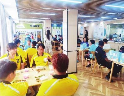 盘活存量资源:梳理辖区闲置空间,将原社区党群服务中心1号门闲置办公区“沉睡资源”纳入改造清单,升级改造成幸福食堂,2024年对幸福食堂外部氛围营造和内部装饰进行升级,首个小哥食堂仅用1个月完成改造,食堂面积约为120平方米,可同时容纳50人就餐。
