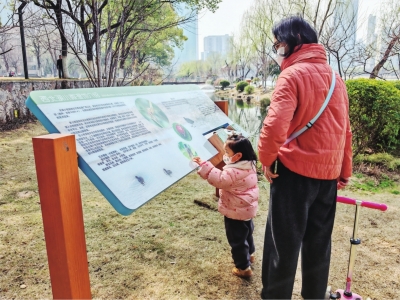 记者看到,西北湖绿化广场沿着湖堤,安装了10组崭新的科普牌及互动装置。从生态价值到物种百科,让市民游客一站式读懂小微湿地。