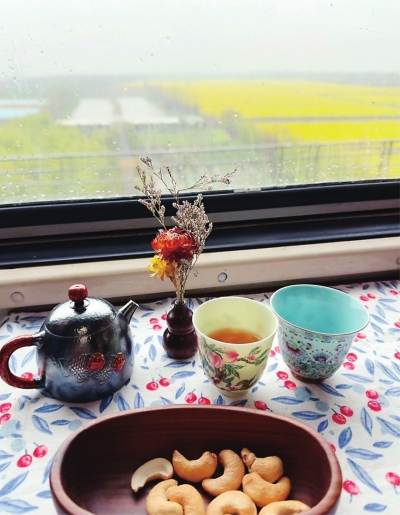 | 桌上的茶具和窗外的油菜花合影。 受访者供图 |