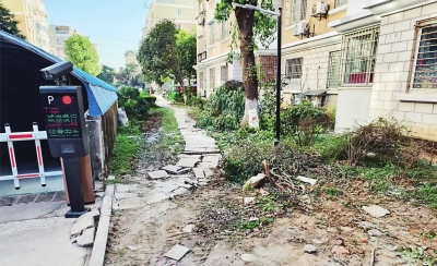 在5栋门前,有一座废弃多年的凉亭,曾经是小区的“标志性建筑”,后来因年久失修成了杂物堆放处。周边裸露土地杂草丛生,老人绕道走,孩子不愿来。