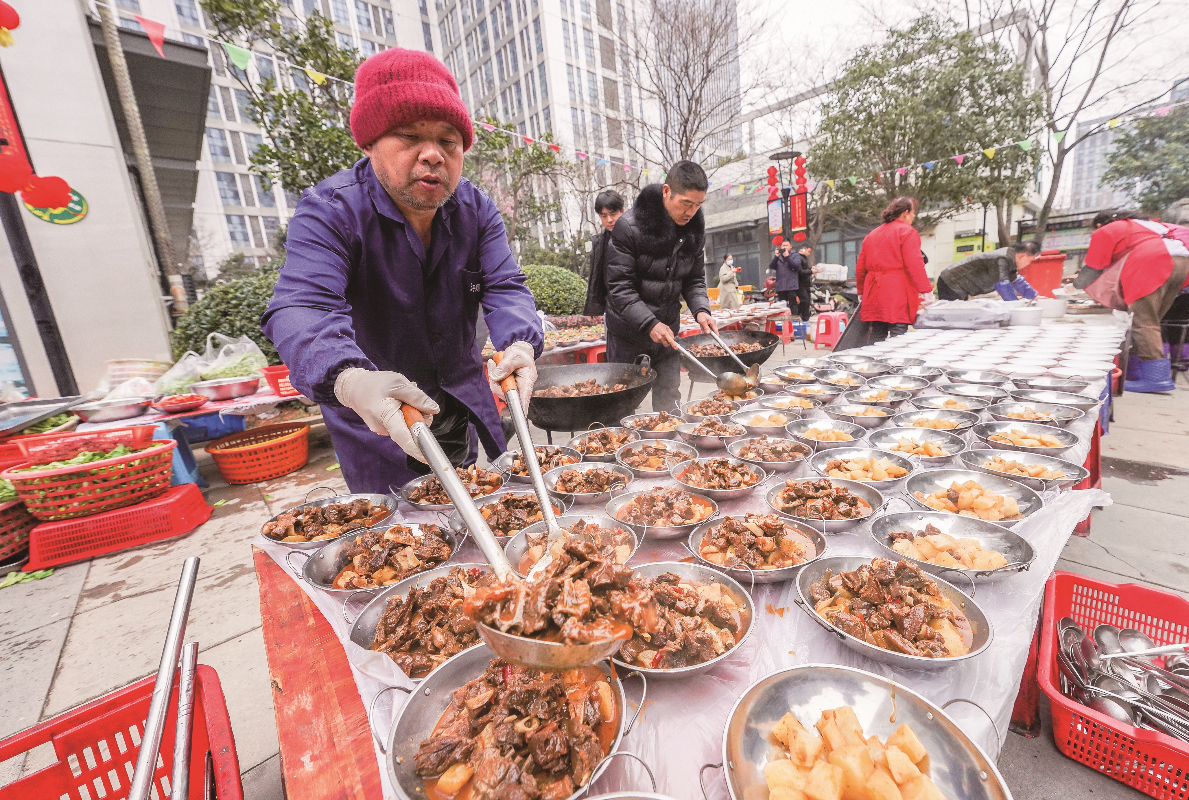 “上菜啦!”随着一声嘹亮的嗓音,物业工作人员、志愿者们将一盘盘热气腾腾的羊肉火锅、红烧鲈鱼、土鸭火锅、鸡子烧莴笋、肉夹馍等传统美食端上桌。居民们围坐在一起品尝美食,“好吃”“暖心”的赞美声不绝于耳,邻里之间边吃边唠家常。