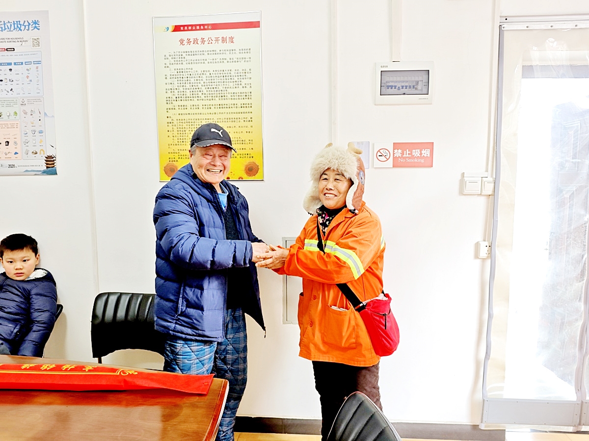 吴爹爹拉着环卫女工殷爱珍不住地说“谢谢” 通讯员供图