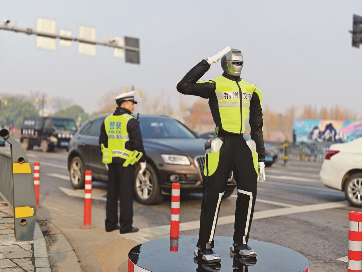 2月2日,身着“荆州交管”执勤服的机器人交警,一上岗便展现出灵活的执勤能力。在古城东门路口,它凭借精密的视觉识别系统,时刻“紧盯”路口动向,一旦发现电动车骑手未佩戴头盔、非机动车越线停车等违法行为,它会立即响起警示哨音,同步做出标准交通手势,配合清晰语音开展劝导,柔性干预交通不文明行为。