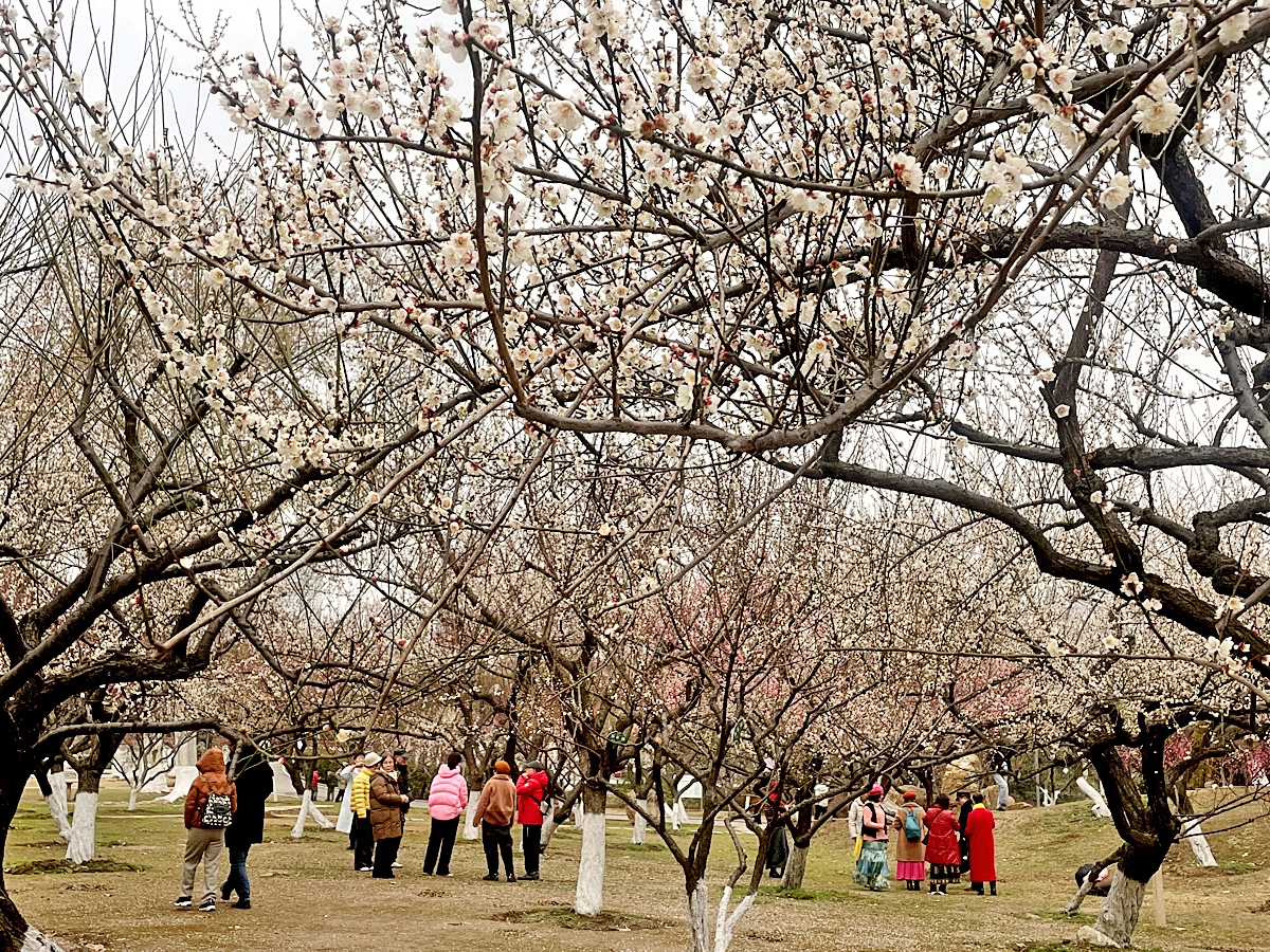 据了解,梅花山共有77种、360多株梅花,包括江梅(单瓣)、宫粉、朱砂、玉蝶、杏梅等品种群,大部分正在盛开,好不热闹。