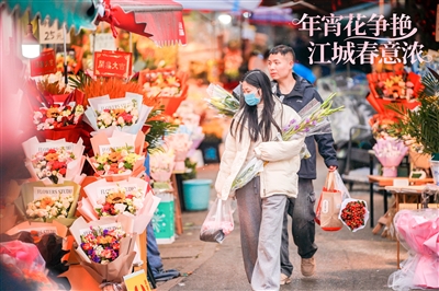 临近春节,江城各大花卉市场的年宵花卉迎来销售旺季。 2月9日,汉口循礼门花卉市场一派热闹景象。花市摆出了百合、银柳、冬青等年宵花,还上新了澳洲蜡梅、雪柳等鲜切花,消费者赏花购花,喜迎马年春节。楚天都市报极目新闻记者宋枕涛 摄影报道