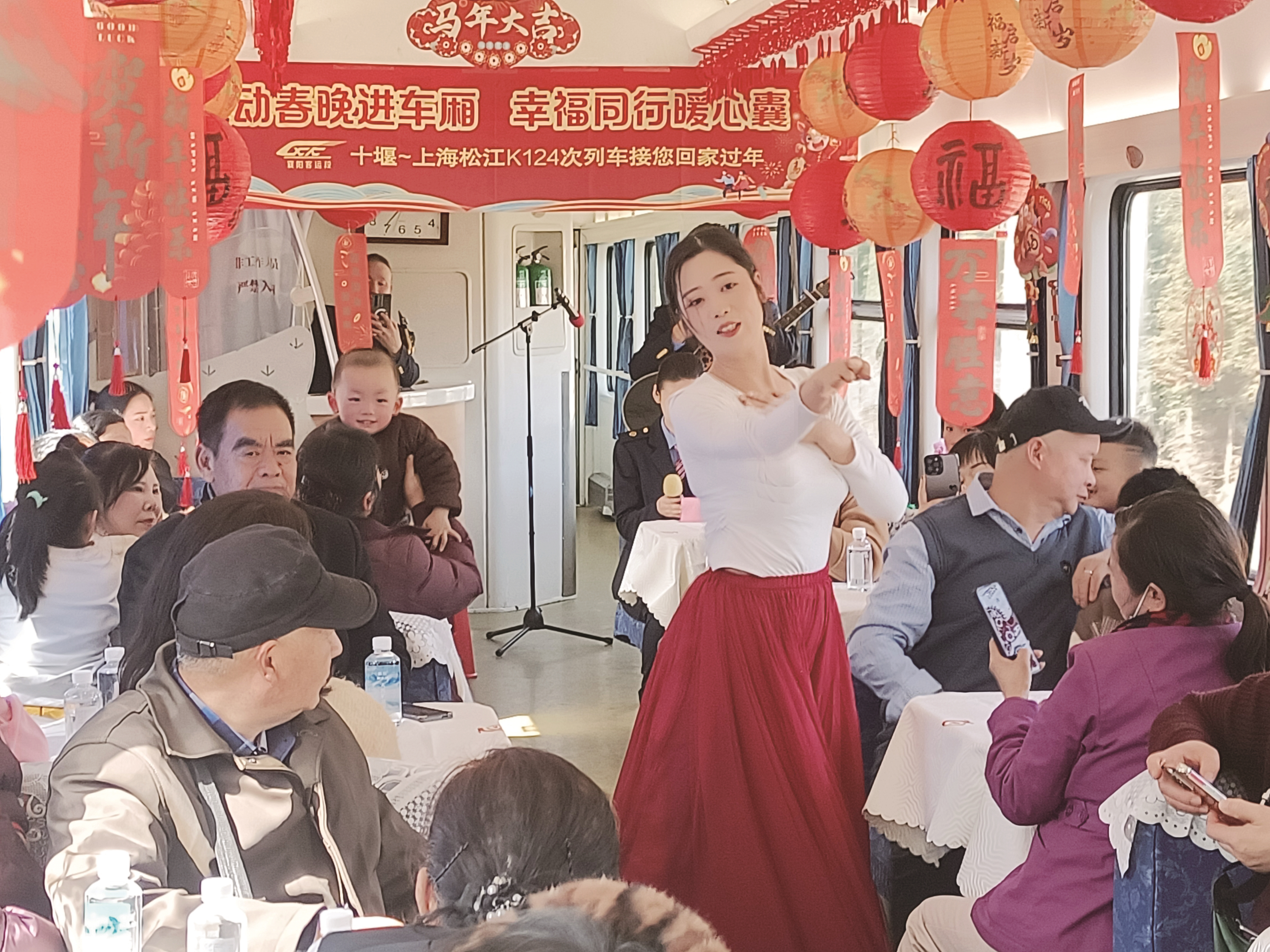 精彩演出间隙,暖心互动持续升温。工作人员将马年福字贴和小马玩偶送到小朋友手中,5岁女孩思思抱着玩偶,大声喊出“马年吉祥”,稚嫩的声音感染了在场所有人。演出落幕时,旅客们与工作人员齐聚车厢中央,拍摄了一张特殊的小年“全家福”,“龙马精神,马年吉祥”的齐声祝福,被镜头永久定格。