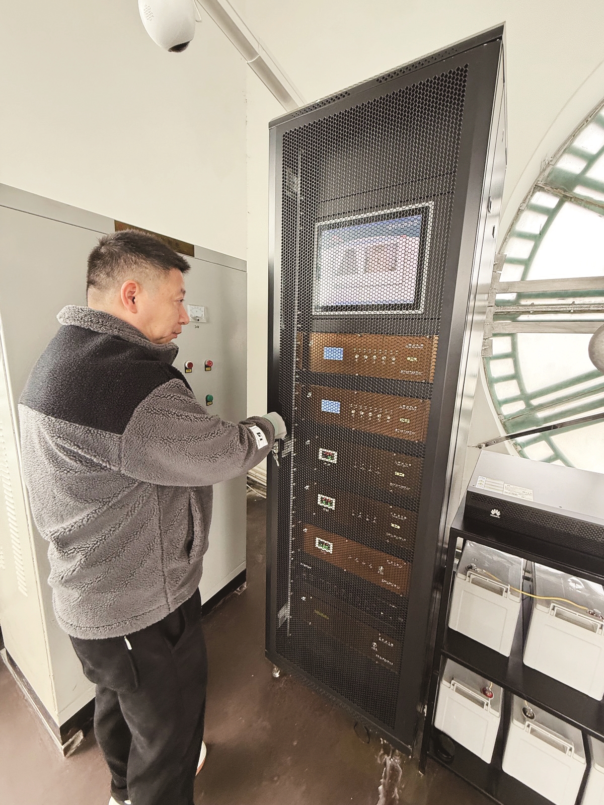 张主锋说,自己对待大钟比对待家人还细心。他每天都要巡检,夏天顶层温度超过40℃,担心仪器受影响,他每天爬上来开空调降温,晚上再爬上来关掉。下雨时,没有玻璃的顶层容易飘雨,他得及时排水。每到假日,他还要爬到最上面的瞭望台,更换国旗,迎接节日。