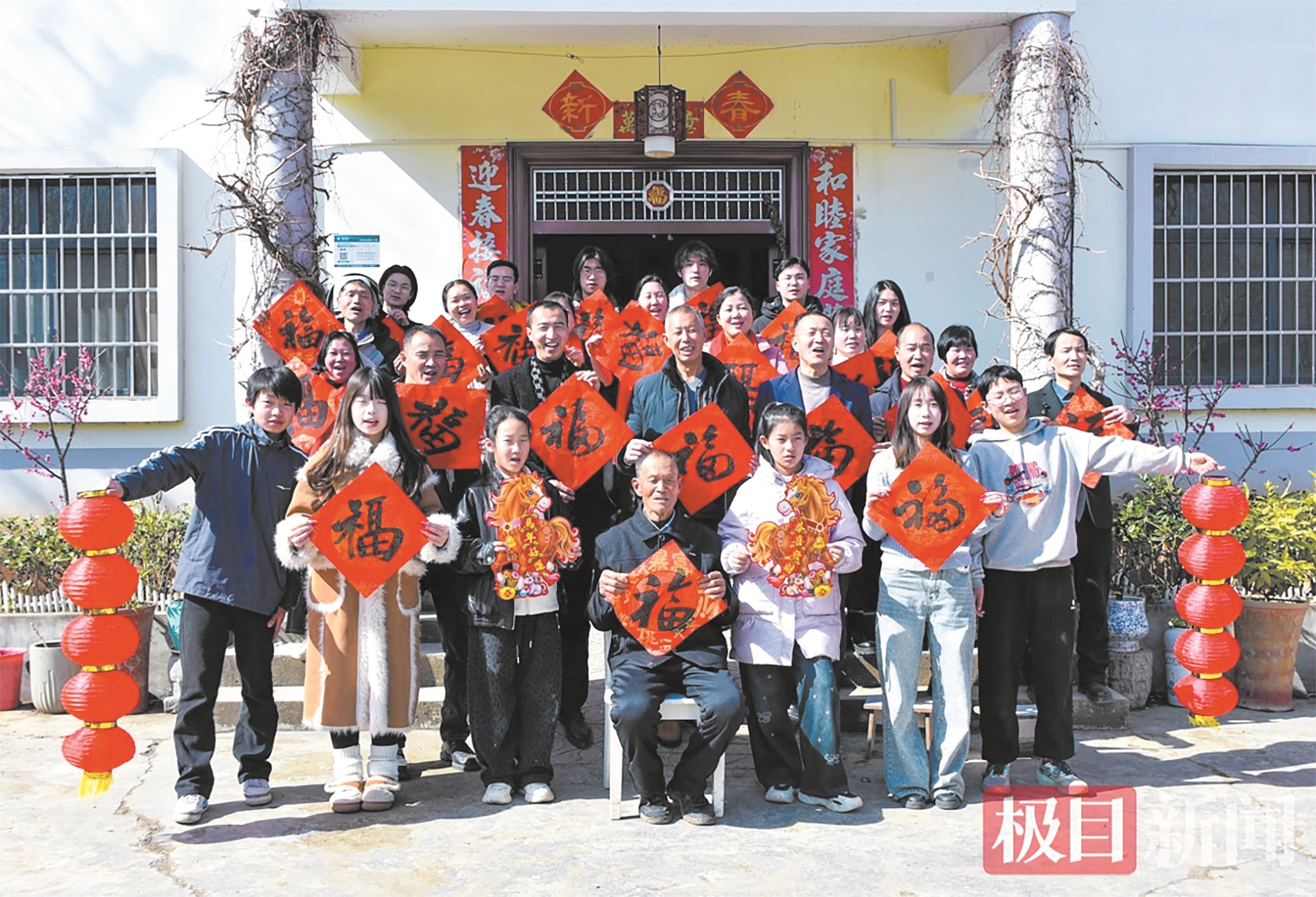 楚天都市报极目新闻讯(通讯员周家山)2月19日,农历大年初三。湖北省十堰市郧阳区刘洞镇杨河村4组,86岁的退伍老兵曹祥德家的小院里热闹非凡。院门口贴着红春联,堂屋里摆下三桌酒席,儿孙们围坐一堂,欢声笑语,其乐融融。这一天,既是新春佳节,也是老伴徐满翠去世一周年的日子——女儿们特意改在初三回娘家,先上山祭拜母亲,再回家团聚,一大家子四代老少27人,同框拍下一张特殊的“全家福”。